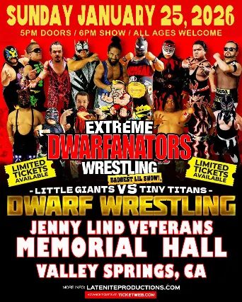 All-Ages Welcome / Family Friendly Show*** Ticketing Options ***General Admission Standing($25 adv / $30 day of show)Standing room only outside of Seated AreaFirst come first serve.VIP Floor & Ringside Seated($45 adv / $50 day of show)Limited Seats. Three rows of ringside seats. First come first serve for choice of seats. Includes early access to venue ahead of General Public.Beer & Wine Supporting Local Non-Profit for 21+Dwarfanators = This is in-ring action just as varied as the personalities of the mini masked wrestlers that perform in the squared circle! Stand and cheer as these real-life superheroes perform aerial assaults that seem to defy gravity! Boo and hiss as the villain cheats to win! Pick your jaw off the floor as you watch technical mini masked wrestlers escape submission holds that will have you screaming, wow! That had to hurt!If you are lucky enough, you may even have the privilege of watching a classic Lucha Libre match such as a hair vs. hair or mask vs. mask match! These are special grudge matches, where the performers put their honor on the line and defend it by any means necessary. The loser is humiliated, the winner has a trophy to show off, and you get to witness it all!We make every show feel like a special event because every show IS a big deal! It is a celebration of timeless Lucha Libre traditions and what the future holds for the culture, all wrapped up in a family-friendly environment suitable for everyone. Come see why los mini enmascarados wrestlers have been a staple of Lucha Libre culture for generations and enjoy the show! We hope you will be back!