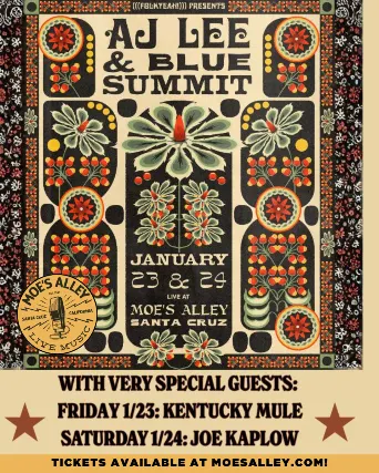 (((folkYEAH!))) presents two nights of AJ Lee & Blue Summit!Friday, January 23, 2026 (night 1)Doors: 8pm / Show: 9pm$25 in advance / $30 day of the show21+*Artist presale starts Wed., Sept. 24th at 10am PT (code required)*General on sale is Friday, Sept. 26th at 10am PT*All sales are final*Avoid scammers! Only purchase tickets from moesalley.com or ticketweb.com===AJ LEE & BLUE SUMMITAJ Lee & Blue Summit are an award-winning, energetic, charming, and technically jaw-dropping band quickly rising on the national roots music scene. Based in Santa Cruz, California, the group met as teenagers, picking and jamming together as kids at local bluegrass festivals until one day, they decided they would be a band. Currently made up of AJ Lee on mandolin, fiddler Jan Purat, and guitarists Scott Gates and Sullivan Tuttle, the band carries that youthful, festival-parking-lot energy with them still today, but at the same time theres a genuine ease and confidence to their music making. As they ready their third studio album, City of Glass their first label release, out July 19th via Signature Sounds their product feels mature and fully realized, while deep in the Blue Summit pocket. City of Glass is a slow burn album, remarkable when considered alongside records released by their peers in recent years. Lee re most interested in discovering themselves, their own music, and sonics and textures truly their own. And, theyre most interested in doing so with their musical and Californian communities. City of Glass, as a result, is an album thats just as much country soul and gritty, bluesy Americana as it is rock club and festival-ready string band fare, all framed through a California folk lens while clearly primed for a much wider audience. AJ Lee & Blue Summit are an exemplary band so unconcerned with being remembered, with being enshrined, that they have gone about making a set of songs that will surely be held onto and cherished forever. City of Glass may one day crumble, but this music will never fade away.KENTUCKY MULEKentucky Mule is an alternative country band based in Santa Cruz, California. The vocalist and songwriter, Coleton Joe Tidwell, effortlessly weaves small-town storytelling and metropolitan modernity. Altogether the band tips its cap to the full spectrum of country music while seamlessly blending in their outside influences.
