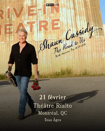 All AgesMODO-LIVE, presents...An Evening WithShaun Cassidy - The Road To UsSaturday February 21st, 2026Rialto TheatreMontreal, QCVIP Q&A Experience Includes: One premium General Admission Seated Ticket Early entry into the venueIntimate pre-show group Q&A led by Shaun CassidyGroup photo in front of the stage with Shaun CassidyAutographed Shaun Cassidy photo and map: The Road to UsRetro I LOVE SHAUN temporary tattooShaun Cassidy My First Crush wine koozieShaun Cassidy tote bagOfficial VIP laminate & lanyardLimited availability