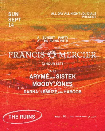 ALL DAY ALL NIGHT + DJ DIALS PRESENTFRANCIS MERCIER brings his Afro-House sounds to The Ruins in American Canyon on Sunday, September 14th for a Sunset party you cant miss.The Ruins is an abandoned cement factory built in the early 1900s and FRANCIS MERCIER plays the opening weekend of this incredible venue. Located 26 miles outside of San Francisco, The Ruins is a Marvel. Exposed architecture, graffitied walls, open air stage, this checks all the boxes.Support by Arym b2b Sistek, Moody Jones, and the Darna crew: LeMuze b2b HaboobFor VIP tables contact infoalldayallnightevents@gmail.com21+ Event | 2-9pm__________________PARKING LOT (click for location)Directions to The Ruins Parking Lot.From American Canyon Road.Take Newell Drive past Newell Open Space.The Parking Lot will be on your Left before you get to Rio Del Mar.Look for Event Signage to Direct you.* Do Not Attempt to enter Newell from Donaldson Way.Directions to the Event from Highway 80 North (Coming from San Francisco, Oakland)Take the Exit to Highway 37 WestExit Fairgrounds Drive and head North.Fairgrounds will turn into Flosden which then turns into Newell Dr.Directions to the Event from Highway 101 (Coming from San Francisco, Marin)Take the Exit to Highway 37 EastExit Fairgrounds Drive and head North.Fairgrounds will turn into Flosden which then turns into Newell Dr.Directions to the Event from Highway 80 South (Coming from Sacramento, Davis)Take the Exit 36 to American Canyon RdTurn Right on Newell Dr.Directions to the Event from Highway 29 North (Coming from Vallejo)Turn Right on American Canyon RdTurn Left on Newell Dr.Directions to the Event from Highway 29 North (Coming from Napa)Turn Left on American Canyon RdTurn Left on Newell Dr.
