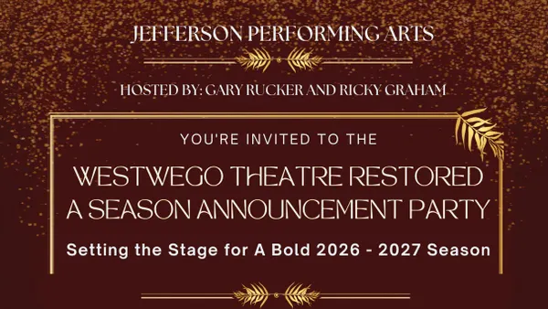 Season Announcement Party and Grand Re-Opening Celebration on Sunday, March 8th at 7pm at the Westwego Performing Arts Theatre (177 Sala Avenue). Join us for an evening of excitement, community, and a first look at the shows that will light up our newly refreshed stage. Come raise a glass, feel the buzz, and be part of the moment as we open a bold new chapter in Westwego. We can?t wait to celebrate with you! Doors open and reception begins at 6:00 PM. Live performances, announcement, and more to begin at 7:00 PM Hosted by Gary Rucker and Ricky Graham Ticket purchase to apply towards your 2026-2027 season ticket purchase.