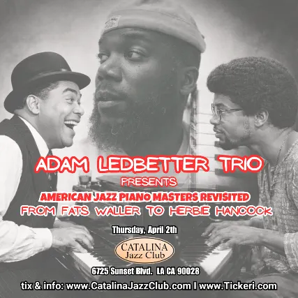 Adam Ledbetter: A versatile pianist known for his expressive touch, strong sense of groove, and deep roots in jazz tradition. His playing blends lyrical phrasing with rhythmic sophistication, allowing him to move comfortably between straight-ahead swing, contemporary jazz textures, and more groove-oriented styles.Ledbetters performances often highlight dynamic interplay with other musicians, showcasing both tasteful accompaniment and thoughtful improvisation. Whether in an intimate trio setting or a larger ensemble, he brings clarity, musical sensitivity, and a refined harmonic sense to the bandstand.American Jazz Piano Masters trace a powerful evolution of sound, culture, and innovationfrom the stride brilliance of Fats Waller to the genre-defying explorations of Herbie Hancock.Waller embodied the Harlem stride tradition: rhythmic drive in the left hand, playful virtuosity in the right, and an infectious sense of swing that helped define early jazz piano. From there, the language expanded through swing and bebop innovators like Art Tatum, whose harmonic genius and technical mastery set new standards, and Bud Powell, who translated Charlie Parkers bebop vocabulary directly onto the keyboard.The modern era brought further transformation with artists such as Thelonious Monk, whose angular melodies and daring harmonies reshaped jazz composition, and Bill Evans, who introduced impressionistic harmony and conversational trio interplay.Herbie Hancock represents the bridge between tradition and innovationrooted in acoustic jazz, yet pioneering electric fusion, funk, and beyond. His work demonstrates how jazz piano remains both deeply historical and forward-thinking.From stride to swing, bebop to modal, and acoustic to electric, American jazz piano masters have continually redefined the instrumentturning 88 keys into a voice of freedom, complexity, and boundless creativity.Catalina Jazz Club6725 West Sunset Blvd.Hollywood, CA 90028*Tickets purchased online receive priority seating.*Single Entree or Drink minimums apply for all tickets