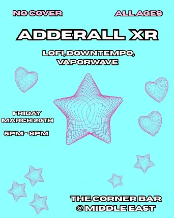 21+ w/Valid I.D. NO I.D.=NO ADMISSIONThe Middle East presents: Adderall XR - All Ages, No Cover, 5:00 pm doors NO VAPING OR SMOKING IN THE BUILDING*** DINE and SKIP the Line ***