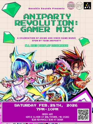 Aniparty Revolution: Gamer MixA Celebration of Anime and Video Game Music Spun By Team Aniparty DJ APPARE DJ TigerScratches DJ SmartsteerDJ Th3rdEye DJ Wazahai DJ MOERO All Ages | Cosplay EncouragedSaturday, Fevruary 28th, 2026Area 405405 E Oliver Street, Baltimore, MD 212027PM - 11PM