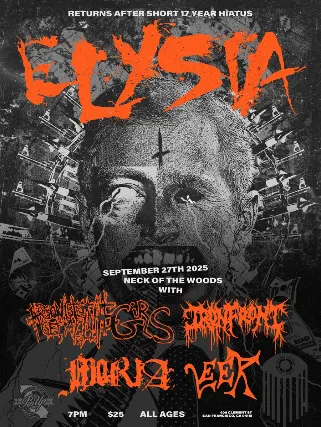 PinUp Presents:ElysiaArsonists Get All The GirlsIron FrontMoriaLeerSaturday September 27th 2025Neck of the Woods 406 Clement St San Francisco, CA 94118$25 in adv $35 at the door(if not sold out)Doors at 6pmALL AGES