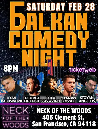 Balkan Comedy Night is a nationally touring show featuring the funniest Balkan-American comedians from around the US and Canada. This night of comedy features headliner Ryan Radusinovic, host Stoyan Angelov, and featured acts Lulu Jovovich, George Dulcich, and Stanko Zovak. Balkan Comedy Night is a show where we make jokes about our culture, language, history, and shared experiences. Each of our comedians can be seen performing regularly at major comedy clubs across the country. The show is in the English language with Serbian, Croatian, Bosnian, Montenegrin, and Bulgarian references. Come laugh at stories from the motherland! Neck of the Woods 406 Clement St San Francisco, CA 94118$30 in advance $40 cash at the doorDoors at 7:00pm, showtime is 8:00pm.21+