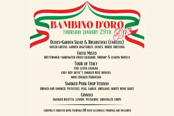 BAMBINO DORO DUEAn Italian Wine Dinner curated through collaboration between BABYGOLDSChef STEVE DOMANIK ll treat yall like the Kings s you are! $125 per person includes five courses and wine pairings. Make a $25 deposit per person via this ticket link to secure your spot, balance payable the evening of the wine dinner. Olives+Garden Salad & Breadsticks (endless)mixed greens, garden vegetables, olives, house dressingFrito Mistobuttermilk-marinated fried calamari, shrimp & lemon wheelsTour of Italyfive layer lasagnachef boy arties smoked beef raviolimini chicken parmesanSmoked Pork Chop Vesuviobrined and smoked, potatoes, peas, garlic, oregano, white wine sauceCannolismoked ricotta, lemon, pistachio, chocolate chips***ALL WITH EQUISITELY PAIRED ITALIAN WINES FROM CREAM WINE COMPANY***