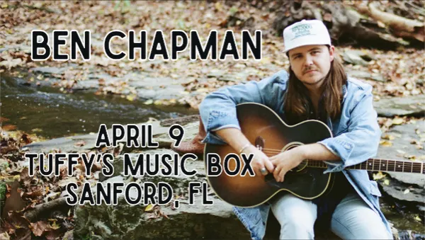 Tuffys Music Box Presents:Ben ChapmanTuffys Music Box & Lounge in Sanford, FLThursday, April 9th, 2026 DOORS 🚪: 7 PMSHOWTIME 🎶: 8 PMAGES: 18+Ben Chapman is a road warrior who has spent the previous three years in a whirlwind of activity writing songs for friends like Hayes Carll, Brent Cobb, and Marcus King; making his Grand Ole Opry debut; and releasing three acclaimed albums of country-fried funky-tonk, but nothing could have prepared him for what 2025 would bring him. His new record Feet on Fire captures that period of wild transition, with songs inspired by Chapmans marriage to fellow songwriter Meg McRee and the arrival of the couples first child. On songs like the guitar-driven title track, Chapman mixes Pink Floyd atmosphere with Crazy Horse crunch, showcasing the full spread of his musical influences. Elsewhere, he tips his hat to his southern roots with the laidback, loping Out in the Country and the Stax-sized soul ballad Missing You. Produced by Grammy-nominated songwriter and producer Anderson East, Feet on Fire captures Ben Chapman as weve never heard him before: his back against the wall and his heart full, determined not only to meet the challenges up ahead, but to write about the process, too. Address: 200 Myrtle Ave, Sanford, FL 32771www.TuffysMusicBox.com**We are committed to making our venue accessible to all patrons. Our facility meets all Americans with Disabilities Act (ADA) requirements, including accessible entrances and restrooms. Reserved tables are an upgrade subject to availability. If you have specific accessibility needs or requests, please dont hesitate to contact us in advance of your visit, or alert one of our staff members, and we will do our best to accommodate you.**