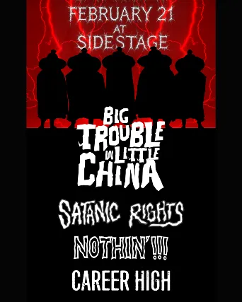 Saturday, Feb 21, 2026 at Sidestage - 700 Osborne StreetBig Trouble In Little ChinaSatanic RightsNothin!!!Career HighDoors 7pm - Music 8pm - All Ages$20 in advance