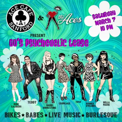 Ace Cafe and The Aces present 60s Psychedelic Tease!Join us at the Ace for a swinging night of live music and burlesque, featuring some of Central Floridas premier performers. This adults-only evening pairs specialty cocktails with dazzling burlesque numbers that celebrate the art of the tease, all set to the unforgettable sounds of the 1960s. A limited number of reserved tables are also available for a comfortable, front and center experience!