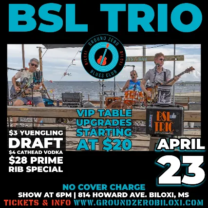 Thursday, April 23๐ 6PM๐ช NO COVER CHARGEWant the best seat in the house?๐๏ธ VIP seating up front available for just $10 per person.Get ready for a feel-good night packed with the songs you know and love! BSL Trio delivers a high-energy mix of classic rock, pop, and R60s and 70s.Blending guitars, bass, drums, and keys, they bring timeless hits to life with tight grooves and rich vintage tone. From the fiery riffs of Santana and Jimi Hendrix, to the legendary sounds of The Beatles, Grand Funk Railroad, and The Rolling Stones BSL plays the soundtrack of a generation.๐ค All killer, no filler.๐ Perfect for dancing.๐ถ Built for singing along.Make it a full night out:๐บ $3 Yuengling Draft๐ธ $4 Cathead Vodka๐ฅฉ $28 Prime Rib Special served with two sidesCome early, grab dinner and drinks, and enjoy an unforgettable night of live music at Ground Zero Blues Club Biloxi.Tag your crew and lets keep the good times rolling! ๐๐ฅ#GroundZeroBiloxi #ClassicRockNight #LiveMusicBiloxi #NoCover #BSLTrio