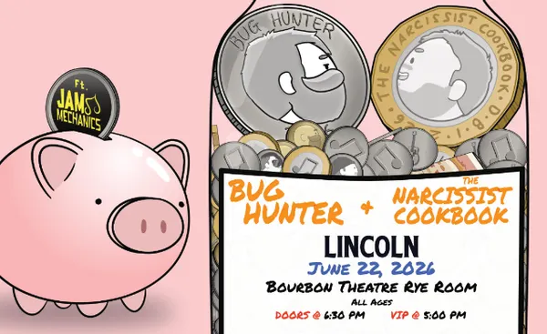 Doors: 6:30 p.m. || Show: 7 p.m. || All Ages$25: GA Advance* || $60: VIP*$2 Under 21 Fee at the Door*Pricing denotes base price before online feesGA = standing room onlyVIP: Come early (5:00 PM) to the venue to listen to both artists play a couple extra songs + audience Q&A, pre-show access to merch (skip the line after the show!) and take a photo with Bug Hunter and The Narcissist Cookbook. THIS TICKET INCLUDES GA ACCESS TO THE SHOW!ADA accommodations may be made by request; please submit through our contact page on our website or message us on social media Tour: Bug Hunter / The Narcissist Cookbook + Jam MechanicsBio: Bug Hunter and The Narcissist Cookbook are bringing their show back on the road in 2026, playing their solo material as well a selection of songs from their hit songwriting podcast, Jam Mechanics. Band: Bug HunterBio: Bug has the very unique skill of being able to put a lifetime of experiences in a single song. There is also a very rare quality where even the most painful lyrics manage to have a silver lining or hope within their theme. Every song has a story, and every story has something profound to pull from it. Every single album and song is an entire rush of words that manage to perfectly capture so many specific emotions and moments in time. There is such a rare quality in the writing, and Ive yet to find another artist that I can fully compare to Bug Hunter. Band: The Narcissist CookbookBio: Mudslinger/songwrecker The Narcissist Cookbook uses five-rounds-rapid storytelling and powerful songwriting as a siege weapon trained on the barker between the stage and the audience. An irreverent, unpredictable and inimitable voice in modern spoken word.