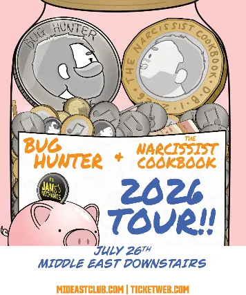 All Ages -- Valid I.D. Required To Drink The Middle East presents: - Bug Hunter, The Narcissist Cookbook, Jam Mechanics - All Ages 6:30pm doors NO VAPING OR SMOKING IN THE BUILDING*** DINE and SKIP the Line ***