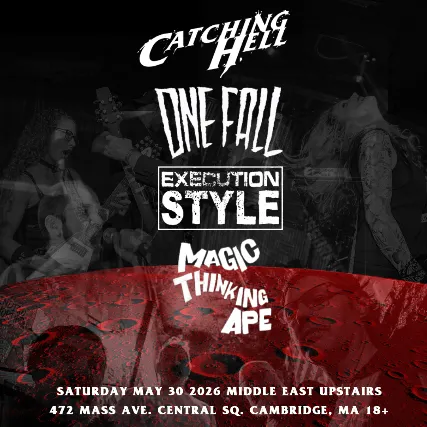 18+ w/Valid I.D. NO I.D.=NO ADMISSION The Middle East presents: Catching Hell, One Fall, Execution Style, Magic Thinking Ape 18+, $15, 8:00 PM Doors NO VAPING OR SMOKING IN THE BUILDING*** DINE and SKIP the Line ***
