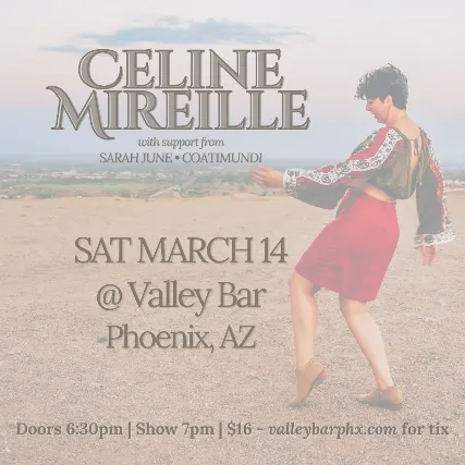 CELINE MIREILLEwith special guestsSARAH JUNECOATIMUNDIThis show marks Phoenix-based artist Celine Mireilles first time taking the beloved Valley Bar stage. While her recently-released debut album SALUTATIONS first introduced listeners to her world, this night is about showcasing the full spectrum of her artistry: bringing beloved tracks from the album to life, premiering brand-new originals, and sharing a few familiar songs reimagined.Backed by a full live band and rich harmonies, Celine brings warmth, storytelling, and emotional depth to the stage in a way that feels both intimate and expansive.The magic starts the moment the music begins, with special performances by Sarah June and Coatmundi, setting the tone for an immersive, genre-blending evening from start to finish.Saturday, March 14th 2026Doors at 6:30 / Show at 7:0016+Advance General Admission Ticket: $16 + feesDay of Show GA Ticket: $20 + fees