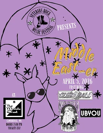 18+ w/Valid I.D. NO I.D.=NO ADMISSION The Middle East presents: - Veterens Rock Music Festival Presents: Middle East-er ft. Club 9 Ball, Dred Buffalo, Vanna Pacella - 18+ $12 7:00pm doors NO VAPING OR SMOKING IN THE BUILDING*** DINE and SKIP the Line ***
