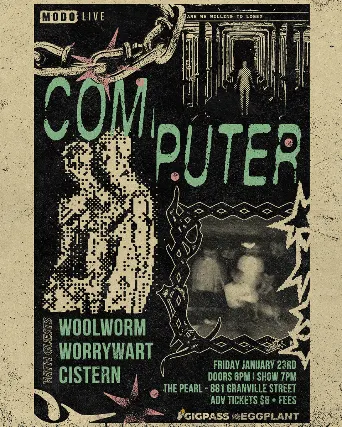 Legal Age 19+ (Valid Photo I.D. Required)Gigpass, MODO-LIVE, I am the Eggplant present...COMPUTERWOOLWORMWORRYWARTCISTERN Friday January 23rd, 2026The PearlVancouver, BC
