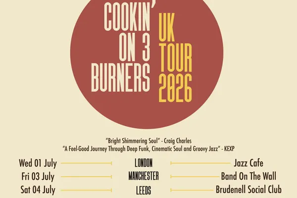 On stage, Cookin' On 3 Burners are a must-see live act. Career highlights include performances at the Roundhouse (UK), Tokyo Jazz Festival, Live Alcazar (Rome), Sydney Festival, and numerous sold-out tours across Europe, the UK, and Australia.For their 2026 tour, the band will be joined by a rotating lineup of powerhouse vocalists, bringing fresh energy to an already electrifying show. Whether delivering razor-sharp instrumentals or soul-soaked anthems, Cookin' On 3 Burners continue to evolve while staying true to their deep funk roots.Always fire. Always Cookin'.