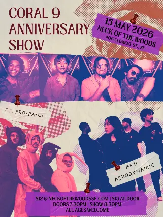 Coral 9Pro-PainAerodynamicFriday May 15th 2026Neck of the Woods 406 Clement St San Francisco, CA(upstairs)$12 in adv $15 at the doorDoors at 7:30pmALL AGES