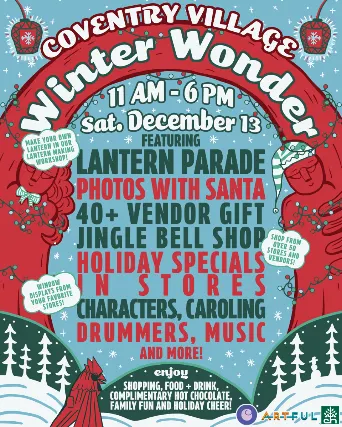A holiday event like no other! Coventry Villages annual pop-up markets and family activities paired with Robin VanLears (founder of Parade the Circle) newest cultural creation! Join us on Saturday, December 13 for a celebration of Winter Wonder and Lantern Parade in the heart of Coventry Village! Starting at 11:00 AM, the street will be buzzing with holiday cheer, leading up to the Lantern Parade! Come out for:- Jingle Bell Holiday Shop (40+ vendors!) at Grog Shop and B Side Lounge- Lantern making workshop hosted by ARTFUL (more below on the lantern parade!)- Photos with Santa- Characters- Winter storytime and hot chocolate at the Heights library- Snowflake and card making hosted by Lake Erie Ink- Throwback Holiday favorites movie screenings hosted by Lake Erie Ink- Carolers- Face Painting- Holiday specials in stores- Yummy food and treats - including baked goods from Baking for Good- Drummers- Holiday Window Display Contest- AND MORE! The day will culminate in the Lantern Parade starting at 5:00 PM, where neighbors parade through the area brandishing handmade lanterns made from recycled materials! For the schedule and more information about the lantern workshop and procession, head to artfulcleveland.org. The full event schedule is yet to be announced - stay tuned for exact times and details as we get closer to the event!