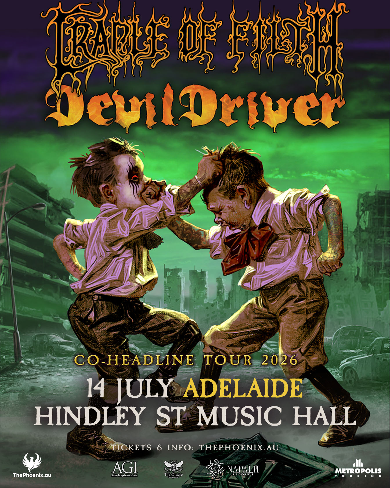 CradleofFilth, led by the inimitable Dani Filth, continue to reign as the most influential and enduring name in extreme metal. Their reputation as a singular artistic force and as one of the most insanely entertaining live acts metal has ever produced remains unchallenged. Fresh off the success of their acclaimed 14th studio album The Screaming of the Valkyries, the band is ready to unleash their signature blend of blackened gothic metal, orchestral grandeur, and venomous lyricism on Australian fans who in turn rewarded the band with a fully sold out tour on their last visit.
