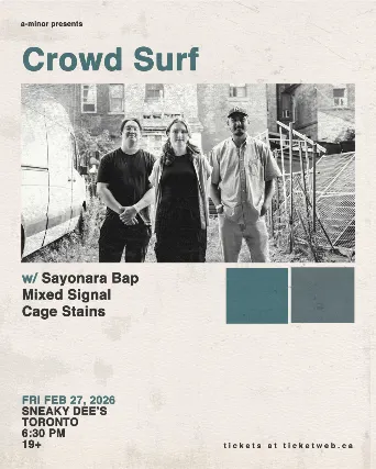 Legal age 19+. Photo I.D. RequiredA-MINOR PRESENTSCrowd Surfhttps://linktr.ee/crowdsurftoSayonara Baphttps://linktr.ee/sayonarabapMixed Signalhttps://linktr.ee/mixedsignalthebandCage Stainswww.instagram.com/cagestains