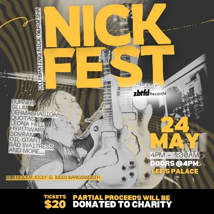 Legal Age 19+ (Valid Photo I.D. Required)Nick Gergesha has been deeply missed since he left this earth at the end of 2025. His beaming energy, boundless warmth, and the way he made people feel seen and welcomed left a lasting mark on everyone lucky enough to know and love him. In the years leading up to his passing, Nick achieved many of the goals he long dreamed about. He married the love of his life, built a beautiful life surrounded by friends, family, craft beer, dogs, and music, played countless live shows in his latest bands Sundowner and Workers Comp, and was really excited about what was next for him.To honour Nicks remarkable legacy, we want to bring his community of family, friends, fellow musicians, and everyone in his orbit together to celebrate him in the big and loud way he would love mostthrough music!We invite you to join us at Lees Palace on Sunday, May 24th for Nick Fest, a special event paying tribute to the life of Nick Gergesha. Nick Fest will feature a lineup of incredible artists - including Bad Waitress, Burner, Computer, Dermabrasion, Glum, Jules Bangsworth, Leona Hell, Moody Jooly, Oil Giant, Quotas, Sovran, and more! - whose talent will fill the room with the same passion and energy that Nick brought into the world. We know that his big and bright spirit will be felt in every riff, fuzz, and cheer! Partial ticket and merchandise proceeds will be donated to the Toronto Humane Society and Palestine relief efforts.
