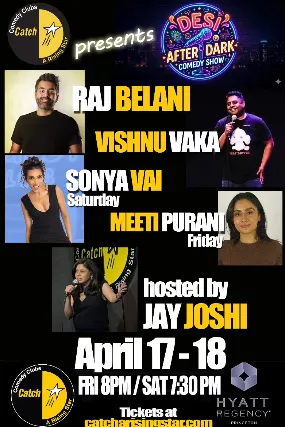 2 item minimum per person (Food and/or Beverage)Catch A Rising Star Comedy ClubPresentsDESI AFTER DARKRaj BelaniVishnu VakaSonya VaiJay JoshiMeeti Puraniwww.catcharisingstar.comBox Office781.568.1471Shows Every Friday and Saturday at 7:30pmLast Minute Ticket Giveaways & Enter To Win ContestsTake a moment and pull out your cell phone and send a text to 555888 with LOL as your message. You will be entered into all of our contests including the FREE year of Comedy contest as well as last minute ticket giveaways. Text us to get added to the list today!Corporate & Private Parties & FundraisersFor your corporate & private shows or how to do a fundraiser at our venue or a venue of your choice please contact mike@catcharisingstar.com for more information. Our shows are a great way to raise money for your school, organization and charities Happy Birthday From CatchIs it your Birthday the week of the show? Then you get in FREE!!!! Must have proper ID showing date of birth & reservations required to get in for FREE! Call 609-987-8018 for information Twitter/Facebook/FourSquareFollow us on Twitter @CatchNewJersey for all of our locations throughout New Jersey& become a fan of ours on Facebook, http://goo.gl/RLxOeK for FREE tickets, information on upcoming shows, latest contests & ticket discounts only available to Twitter & Facebook users Check in with Foursquare to unlock special deals & FREE tickets to our Comedy Shows Term & Conditions14-17 with adult to enter the club & 21 to drink. There is a 2 item minimum per person during the show. (Food and/or Beverage). All sales are final although we will exchange your tickets for a future show if you cannot attend. Must call 48 hours before show to exchange tickets. Large Party SeatingIf you have a party of 6 or more please call the box office at 609-987-8018 so we are aware of the seating arraignments & you can seat together. Catch A Rising Star Comedy ClubLocated Inside The Hyatt Regency PrincetonCorner of Route 1 North & Alexander Rd East102 Carnegie CenterPrinceton NJ 08540