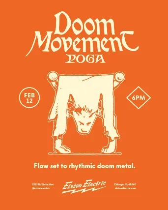 Join us for the Doom Movement Yoga Practice at Elston Electric on February 12, 2026 at 6:00 PM (Central Time).Lets come together for a rejuvenating session of yoga in a unique setting. Whether youre a seasoned yogi or a beginner, this practice is open to all levels. Come unwind and stretch to some rhythmic doom metal. Enjoy a beverage with your fellow yogis post-flow, included with each ticket. BYO mat & water. See you there!