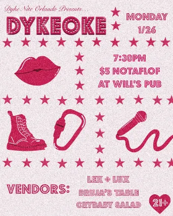 Dykeoke - Dyke Nite Orlando Come sing karaoke with a bunch of dykes! At Wills Pub on January 26th, 2026 7:30PM Doors $5 Cover21 and up