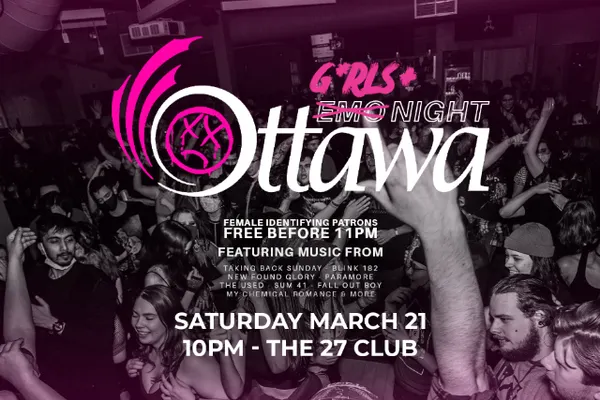 GENERAL ADMISSION - LEGAL AGE 19+Emo Night consistently sells out in advance - grab your tickets now for our G*rls+ March edition with special guest DJ Emo Night Ottawa - G*rls+ Night The G*rls+ are taking over this month - special guest Le HarttFemale identifying patrons free before 11pmEmo Night Ottawa is back at The 27 Club with the best in emo, pop-punk, screamo, metalcore and rock bangers and an extra hour to boot!10pm doors - 1:45am last call$5 - EARLY BIRD 1 $10 - EARLY BIRD 2 $15 - GENERAL ADMISSIONmore at the door - if not sold out :0licensed 19+ w/ photo IDpresented by Beyond The Pale-----PLEASE NOTE: Vax and masks are no longer required, but masks are always encouraged.ENTRY REQUIREMENTS ARE SUBJECT TO CHANGE PENDING PROVINCIAL HEALTH REGULATIONS-----limit of four Early Bird 1 / six Early Bird 2 / ten regular tickets per household/credit card.lineup, date, venue, times and ticket price subject to change without notice.all tickets sales are final. no exchanges, upgrades, or refunds.any tickets purchased by suspected resellers are subject to cancellation without refund.