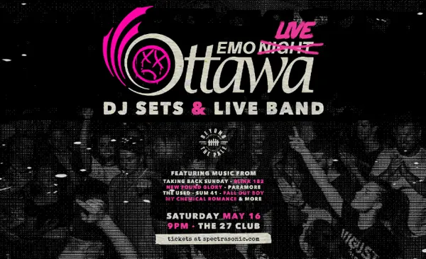 GENERAL ADMISSION - LEGAL AGE 19+our past Emo Night Live Band Editions sold out WAY in advance, so grab your tickets now for the return in November!9pm early start, a live band set at 11pm and DJ sets before and afterEmo Night Ottawa is back at The 27 Club with the best in emo, pop-punk, screamo, metalcore and rock bangers!9pm doors - 1:45am last call$10 - EARLY BIRD 1 $15 - EARLY BIRD 2 $20 - GENERAL ADMISSIONmore at the door - if not sold out :0licensed 19+ w/ photo IDpresented by Beyond The Pale-----PLEASE NOTE: Vax and masks are no longer required, but masks are always encouraged.ENTRY REQUIREMENTS ARE SUBJECT TO CHANGE PENDING PROVINCIAL HEALTH REGULATIONS-----limit of four Early Bird 1 / six Early Bird 2 / ten regular tickets per household/credit card.lineup, date, venue, times and ticket price subject to change without notice.all tickets sales are final. no exchanges, upgrades, or refunds.any tickets purchased by suspected resellers are subject to cancellation without refund.