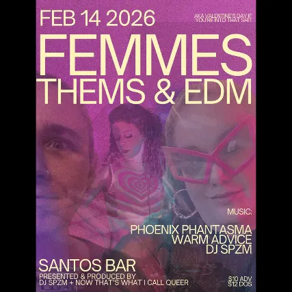 Join us for Femmes, Thems, and EDMs, a new queer dance party centering femmes, thems, and anyone who loves dance music that feels as good as it sounds.Produced s What I Call Queer, Femmes, Thems, and EDMs is dance music curated by dolls, for dolls emotional builds, lush basslines, and tracks meant to be felt in the body. This is about intimacy on the dance floor: eye contact, sweat, release, and movement that connects you to yourself and each other.Featuring live DJ sets by:Phoenix PhantasmaWarm AdviceDJ SPZMWhether youre dancing with a lover (or two), flirting with a stranger, or romancing yourself, this night is for queer bodies moving together in a space built with care.Come dressed soft, slutty, romantic, feral whatever helps you connect with the beat.