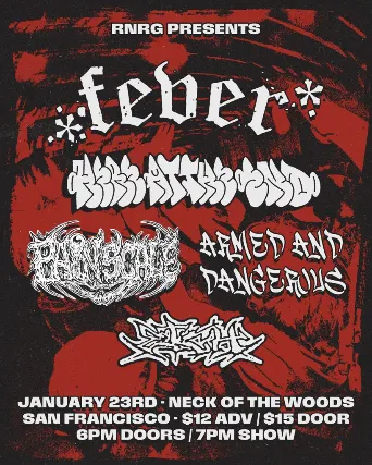 R'N'RG Presents:FeverHere At The EndPain ScaleArmed And DangerousEtchFriday January 23rd 2026Neck of the Woods 406 Clement St San Francisco, CA 94118(upstairs)$12 adv $15 at the door6pm doorsAll ages