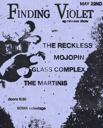 Finding Violet EP ReleaseThe Reckless MojopinGlass Complex The Martinis ______When purchasing tickets, please pick your favorite artist, but know this grants you entrance for the entire show.______Craft Beer AvailableGeneral Admission. Standing Room Only. All Ages.Clear Bag PolicyThe following bags are allowed: Clear Plastic, Vinyl, or PVC Bags (Maximum Size: 12x6x12) Small Clutch Bags Approximately the size of a hand (Maximum Size: 4.5x6.5)