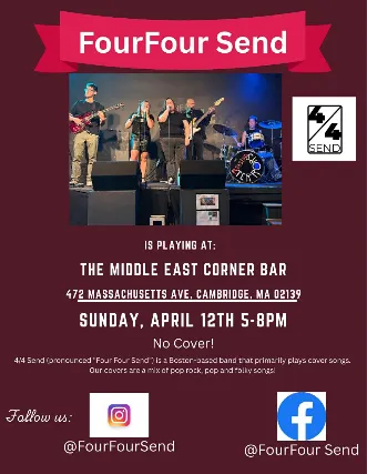 21+ w/Valid I.D. NO I.D.=NO ADMISSIONThe Middle East presents: FourFour Send - 21+, No Cover, 5:00 pm doors NO VAPING OR SMOKING IN THE BUILDING*** DINE and SKIP the Line ***