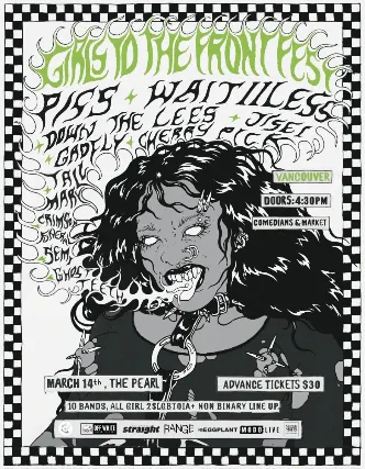 GIRLS TO THE FRONT FESTIVALft. Piss | WAIT//LESS | Down the Lees | JISEI| Gadfly | Cherry Pick | Tall Mary | Crimson Funeral | Semi | Ghost TeethSaturday March 14th, 2026The PearlVancouver, BCGirls to the Front is a rock music festival dedicated to spotlighting female, non-binary, and 2SLGBTQIA+ artists, along with their passionate fan bases, at the forefront of the stage. Inspired by Kathleen Hanna of Bikini Kill, Girls to the Front amplifies diverse voices and is expanding its reach with a Vancouver edition of the festival, happening Saturday, March 14, 2026, at The Pearl on Granville with $2 from every ticket sold will be donated to the Downtown Eastside Womens Shelter. Female, non-binary, and 2SLGBTQIA+ artists often face significant barriers in the music industry, including underrepresentation and limited opportunities. By creating a platform specifically for these artists, the festival offers them the visibility and recognition they deserve. For fans, seeing artists who reflect their identities can be incredibly empowering, fostering a sense of community and belonging.