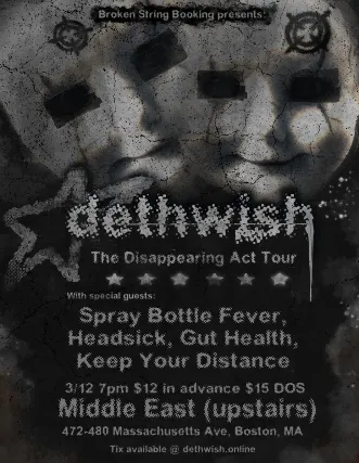 18+ w/Valid I.D. NO I.D.=NO ADMISSION The Middle East & Broken String Booking Presents: Dethwish, Spray Bottle Fever, Headsick, Gut Health, Keep Your Distance - 18+, $12 Advance / $15 Day of Show, 7:00 PM Doors NO VAPING OR SMOKING IN THE BUILDING*** DINE and SKIP the Line ***