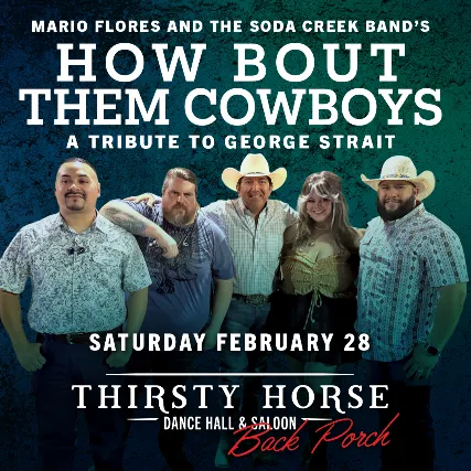 Mario Flores & The Soda Creek Band are bringing their How Bout Them Cowboys - a George Strait tribute to the Back Porch!📅 Saturday, Feb. 28📍 Thirsty Horse Back Porch