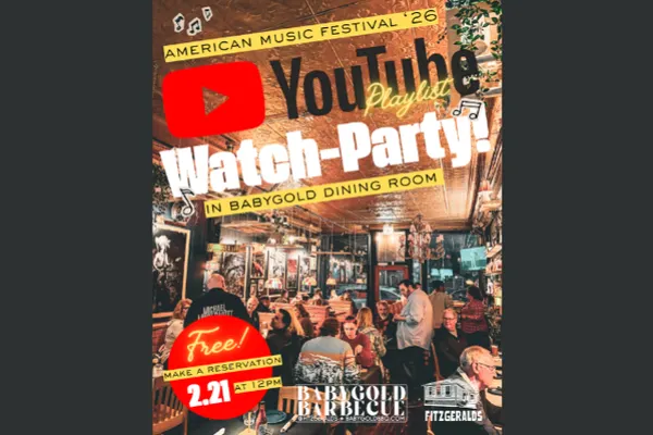 FITZGERALDS NIGHTCLUB PRESENTS:**In BABYGOLD** American Music Festival 26 YOUTUBE PLAYLIST Watch-Party in BABYGOLD Dining Room!FREE / Make a Reservation!!Come grab brunch in the BABYGOLD Dining Room and check out the new space as we play videos from all FITZGERALDS American Music Festival 26 Artists! Video Playlist will start at 12pm. Make a Reservation NOW! :)***PARKING***There is rather limited street parking in the area, we recommend arriving by rideshare, bicycle, or rickshaw. ***AGE RESTRICTIONS***21+, minors admitted with guardian