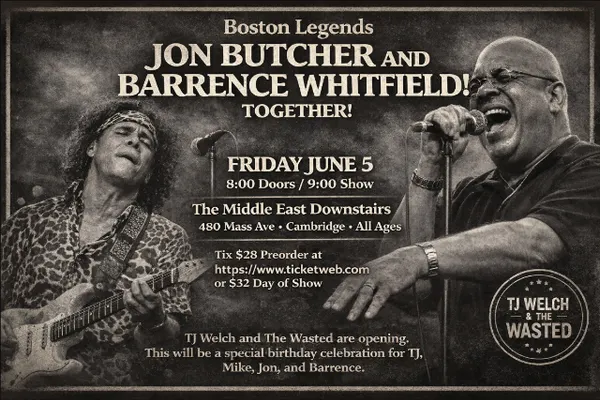 All Ages -- Valid I.D. Required To Drink The Middle East presents: - Jon Butcher & Barrence Whitfield, TJ Welch and The Wasted, All Ages, $28 adv / $32 dos, 8pm doors NO VAPING OR SMOKING IN THE BUILDING*** DINE and SKIP the Line ***
