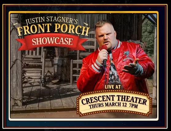 Justin Stagners Front Porch Showcase is a monthly comedy showcase at the Crescent Theater, hosted by Mobiles own Justin Stagner and featuring a hand-picked lineup of up-and-coming comedians from across the region and beyond. Each show brings a new mix of rising talent, sharp perspectives, and unpredictable punchlinesno two nights are ever the same.Think of it like discovering your next favorite comic before they blow up, all in an intimate theater setting built for laughter. Whether youre a die-hard comedy fan or just looking for a fun night out, this is your chance to catch raw, real stand-up the way its meant to be seen: live and up close!Featuring: David Lynam, Jay Dubz, Trent Ellis, Mr Willie, and Carson Taylor