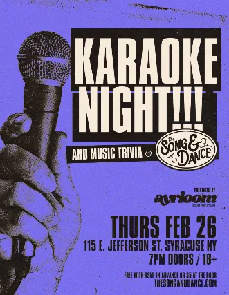 Karaoke Night at The Song & DanceThis is not your regular bar karaoke, come sing a real stage with full concert sound professional lighting and a massive LED wall behind you so the entire room is with you too. No pressure, no judgment, just grab the mic or and have fun. Drink specials all night. You can win concert tickets during short music trivia breaks as well. Well see you there!