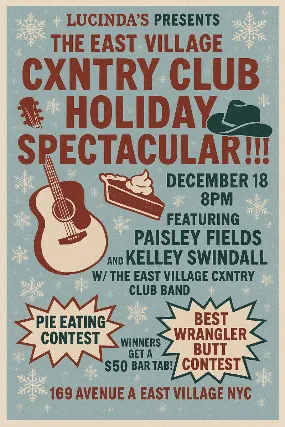Join us for our Monthly East Village Cxntry Club , this time as a Holiday Spectacular!Well Kick off the Night with Free Texas TWO STEP lessons taught by Kendall Reynolds, followed by Live music featuring Paisley Fields and Kelley Swindall, backed by the East Village Cxntry Club Band!Well have our famous Pie Eating Contest and an Ugly Sweater Competition (winners of each receive a $50 bar tab for their next visit!)No Cover!!!Come On Come All!!!