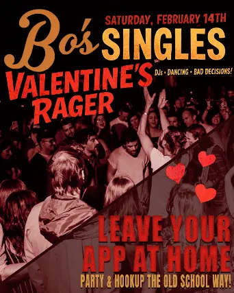 SINGLES HOOK UP x VALENTINES DAY RAGERLETS TRY HOOKING UP HOW WE USED TO...LEAVE YOUR APPS AT HOME - SINGLES VALENTINES DAY RAGERCome party, dance, meet new people and hook up with each other face 2 face.BOS BAR & STAGEFEBRUARY 14. 2026DOORS 7PM. DJ 8PM18+TICKETS $12 + SC - INCLUDES PARTY FAVOURSLEAVE YOUR APP AT HOMESingles Night | No Swiping AllowedBefore profiles. Before algorithms. Before wyd?This is how people actually met.Lock eyes. Buy the drink. Dance a little too close.Write your number on a napkin. Take a chance.No apps. No screens. No excuses.Just real people, real drinks, and real-life chemistry.Come solo. Bring a wingman.Confidence required. Phones optional.Hook up the old-school way.Last call has entered the chat.