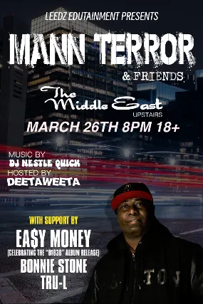 18+ w/Valid I.D. NO I.D.=NO ADMISSION Leedz Edutainment Presents: Mann Terror & FriendsWith Ea$y Money (Celebrating the 01830 Album Release), Bonnie Stone & Tru-L- 18+, $15 Early Bird / $20 Advance / $25 Day of Show, 8:00 PM Doors NO VAPING OR SMOKING IN THE BUILDING*** DINE and SKIP the Line ***