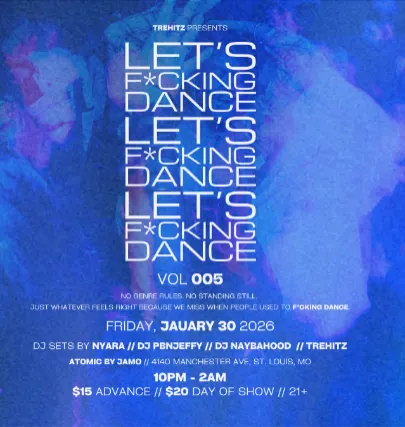 LETS F*CKING DANCE 005Live at Atomic FRIDAY, JAUARY 30 2026Lets F*cking Dance is exactly what it sounds like. Curated by TreHitz and featuring DJ sets by DJ SETS BY NYARA // DJ PBNJEFFY // DJ NAYBAHOOD I/ TREHITZATOMIC BY JAMO // 4140 MANCHESTER AVE, ST. LOUIS, MO10PM - 2AMThis will be a night of bass-heavy blend of hip-hop, R&B, house, jersey club, New Orleans bounce, and more. No genre rules. No standing still. Just whatever feels right because we miss when people used to f*cking dance.Online Advanced Tickets: $15Day of Show/At Door: $2021+