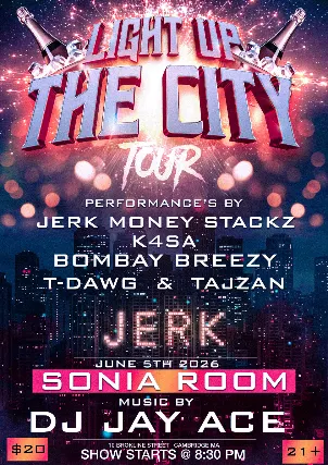 18+ w/Valid I.D. NO I.D.=NO ADMISSIONThe Middle East presents: Light Up the City ft. JerkMoney Stackz, K4SA, Bombay Breezy, T-Dawg & Tajzan - 21+, $18 Advance / $20 Day of Show, 8:00 PM Doors NO VAPING OR SMOKING IN THE BUILDING*** DINE and SKIP the Line ***