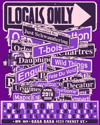 Locals Only is back! Once again holding space for the locals that hold it down in the city all year and are forgotten when the big dawgs come to town and take over all the clubs. So if you want to support local, this is what we doing. Dis dat farm to table music! Very Cherry:Multi-instrumental duo VERY CHERRY pairs Simon Lotts high-octane percussion with David Polks live saxophone, classical piano, and electric guitar, all layered over fully original, textural EDM compositions and beats. Building on 20 years of collaboration, Context Killer (Lott) and Gahdlyke (Polk) continue to evade the status quo with Very Cherry, their latest incarnation and most unique project yet. Described as a genre-melting rave jazz symphony, its human music from the future. Phantom Volumes:Phantom Volumes is a New Orleans based trio led by keyboardist and songwriter Adam Kelly, featuring Dennis Aoun on drums and Tyler Self on bass. The bands sound, self-described as literature rock, blends gothic storytelling, supernatural themes, and powerful musicianship into a dark cinematic live experience.New thousand BioFor 10 years, New Thousand cut his teeth street performing violin on Bourbon and Frenchmen. Probably 800+ nights dancing with you while dodging flying drinks, cops, and the occasional stink bomb. From once having his busking gear used in a street fight on Canal to now playing Burning Man and stages across Europe - the energy and passion stay the same.