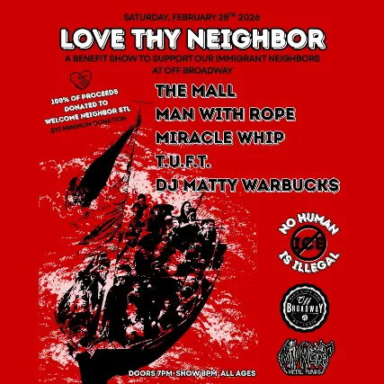 MIDWEST METAL PUNKS PRESENTS:LOVE THY NEIGHBOR BENEFIT SHOW - ALL PROCEEDS GOING TO WELCOME NEIGHBOR STLFT. THE MALLMAN WITH ROPEMIRACLE WHIPT.U.F.T.DJ MATTY WARBUCK$SAT. February 28, 2026Doors 7PM | Show 8PM$10 GENERAL (more donations welcome at the door!)General Onsale begins NOW!All Ages (21+ with valid ID to drink, $3 minor surcharge under 21)Welcome Neighbor STL is a local non-profit dedicated to supporting refugees and immigrants with various programs that are designed to assist them in their new lives here in St. Louis.In order to combat third-party resale, we have recently enacted a delivery delay on all tickets purchased online. You will receive an order confirmation immediately after your purchase, and your tickets will be emailed to you/made available in your Ticketweb account TWO DAYS before the event.